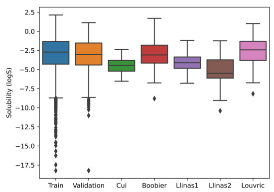 We learned that neural network models perform well with more datapoints; thus, we utilized the datasets of Cui et al. [34], AqSolDB [38], and Lovric [40] for SolPredictor training. The datasets contained 9943, 9982, and 583 datapoints, respectively. All datasets were concatenated and duplicate SMILES were removed. The final combined dataset contained 17,826 datapoints. The dataset was divided into 90% for training and 10% for validation. The validation dataset was used in the SolPredictor hyperparameter optimization process. Each record had a SMILES string and logS value. logS refers to the logarithm of the water solubility of a compound and is measured in mol/L; a higher logS indicates higher solubility and vice versa. The logS values ranged from −17.46 to 2.13. The length max, min, mean, std, and var for SMILES were 783, 2, 34, 25, and 662, respectively. The model was tested on five independent datasets from: Cui et al. [34], Boobier et al. [39], Lovric et al. [40], and Llinas et al. [41] set1 and set2, which contained 62, 95, 95, 99, and 32 datapoints, respectively. Each test dataset was checked against a training dataset for SMILES duplicates, and datapoints were deleted from the test dataset if any duplication was found. As shown in Figure 6, kernel density estimation plots represent the training, Cui2020 [34], Boobier2017 [39], Lovric2020 [40], and Llinas2020 set1 and set2 [41] test datasets. The x-axis represents the logS range, whereas the y-axis represents the density. The higher the y-axis value at a particular point on the x-axis, the higher the probability of that point. Figure 7 shows boxplots for the training and test datasets. Several of the logS values from the datasets of Cui et al. [34] and Llinas et al. [41] set2 datasets were non-overlapping with the training dataset. The Llinas et al. [41] set2 boxplot median line was lower in the interquartile range, which shows that the logS values are positively skewed.