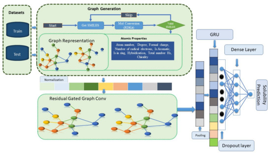 A model was developed for solubility prediction using a residual gated graph neural network. As shown in Figure 9, SMILES data were converted to graphs using the PyG library. The model uses nine node features as inputs. The features were normalized and passed to the linear layer, and the RGNN convolution was applied. After global pooling, embedding was employed as a sequence and the GRU was used to capture long-term dependencies. Finally, a dense layer was used to calculate the solubility.