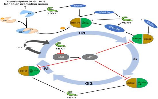Inhibition of YBX1 by knockdown results in decreased expression of the cell cycle “activator” E2F2 (E2F transcription factor 2) and an increase in the expression of the “repressor” E2F5. Moreover, ChIP experiments have revealed that endogenous YBX1 binds to the promoters of classical E2F1-regulated genes in MCF-7 cells, suggesting that YBX1 may act as a potential transcriptional regulator of these genes [53]. Another study has confirmed that the promoters of E2F1, E2F2, E2F3, E2F4, and E2F7 are targeted by YBX1 [54].