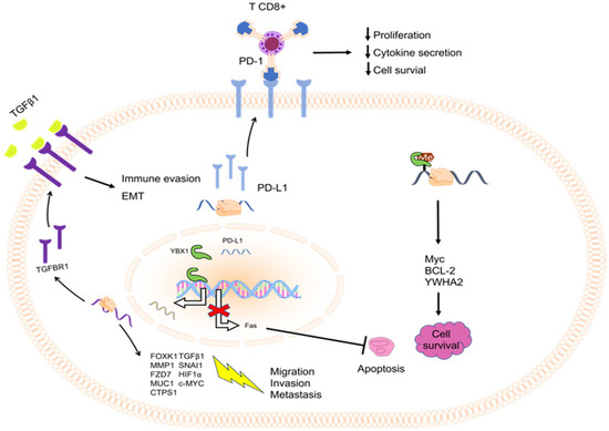 Role of YBX1 in cell death decision, migration and invasion activation, and immune destruction evasion. YBX1 transcriptionally and translationally regulates the expression of a vast range of genes, which eventually attenuate cell survival, the epithelial–mesenchymal transition process, and avoid+ immune surveillance.