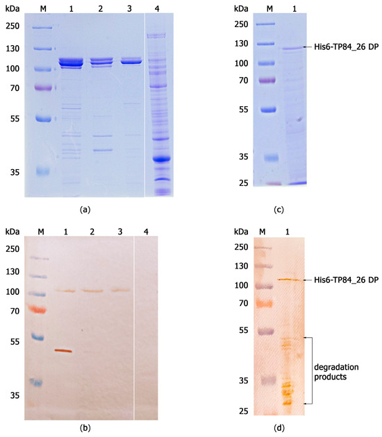 Moving the His6-tag to the C-terminus might help in IMAC purification, although this avenue was not further explored. The intact His6-TP84_26 DP reacted poorly on the Western blot with the anti-His6-tag antibodies (Figure 2d). This may indicate that the His6-tag epitope, recognized by the antibodies, is inaccessible in the intact polypeptide. The removal of SDS during Western blotting membrane washing in SDS-free buffer may partially result in the renaturation of the His6-TP84_26 DP. However, its large polypeptide size (112 kDa) may also contribute to incomplete protein transfer onto the Western blot membrane [23], thus decreasing the sensitivity of the Western blotting detection (Figure 2d).