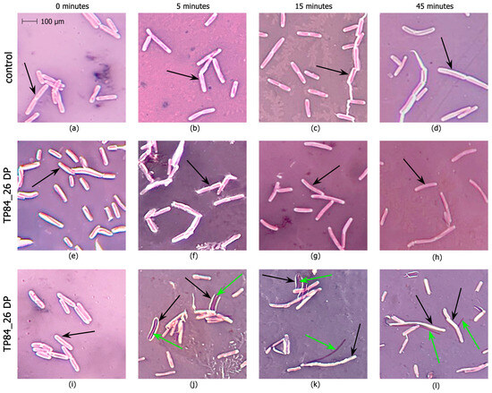 Capsules stripped from G. stearothermophilus cells using the developed Maneval functional assay. Microscopic evaluation of stripping of the bacterial capsules: control panels (a–d), thick capsules of G. stearothermophilus without the enzymatic treatment, observed at 0, 5, 15, and 45 min; panels (e–h), the effect of the enzymatic treatment of G. stearothermophilus cells with TP84_26 DP, observed at 0, 5, 15, and 45 min; panels (i–l), the effect of the enzymatic treatment of heat-killed G. stearothermophilus cells with TP84_26 DP, observed at 0, 5, 15, and 45 min. Progression of the capsule digestion and vegetative cell release is marked with black arrows (capsules) or green arrows (vegetative cells).