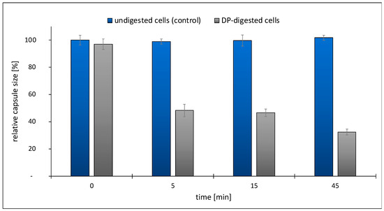 A novel DP functional assay was developed based on in vitro capsules stripped from intact G. stearothermophilus bacterial cells. The assay was dedicated to thermo-stable His6-TP84_26 DP and TP84_26 DP, at the optimal growth temperature of 55 °C for the bacterial substrate cells. The substrate for the enzyme was prepared using streptomycin-sensitive, native G. stearothermophilus 10 cells (100 mL of the culture) that were grown to the early log phase (OD600nm = 0.3) and then centrifuged (5000× g, 10 min, 10 °C), subjected to two washes with cold TMC buffer (50 mM Tris–HCl pH 7.5 at 20 °C; 10 mM MgCl2, 5 mM CaCl2), supplemented with streptomycin (100 mg/mL) and sodium azide (1 mM). The cells were resuspended in 5 mL of the same buffer, aliquoted, frozen in liquid N2, and stored at −80 °C. Digestion reaction variant 1: The bacteria were treated with the recombinant His6-TP84_26 DP or recombinant TP84_26 DP (4 μg, 10 μL preparation added at 4 mg/mL in TMC buffer) at 55 °C in 100 μL of the cell substrate for time intervals of 0, 5, 15, and 45 min with shaking at 300 rpm to prevent cell sedimentation. Digestion reaction variant 2: As in variant 1, with additional heat treatment at 90 °C for 20 min prior to the DP digestion. Following the treatment, the capsules were detected using Maneval’s negative staining method and evaluated using light microscopy to assess the degree of capsule stripping. The determination of the capsules’ sizes was conducted upon observation (1600× magnification) through a microscopic ocular scale, photographing the microscopic image, enlarging the image, and measurement. This allowed for a quantitative evaluation of the capsules’ digestion progress (Figure 4).