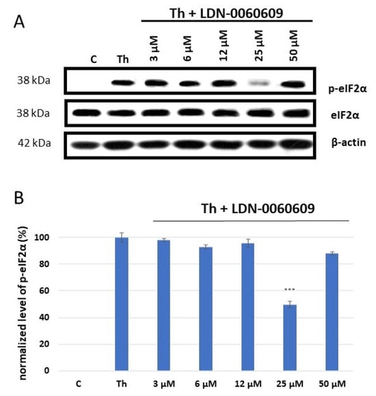 Th effectively induced ER stress in HRA cells: the level of p-eIF2α was significantly elevated in HRA cells incubated with 500 nM Th in comparison with control HRA cells, i.e., those cultured in complete medium only. Furthermore, a significant decrease in ER stress-dependent eIF2α phosphorylation was found in HRA cells under ER stress conditions (ER-stressed HRA cells) caused by treatment with LDN-0060609 PERK inhibitor. The obtained results indicate that LDN-0060609 had the highest activity in ER-stressed HRA cells at a concentration of 25 μM, with LDN-0060609 significantly inhibiting eIF2α phosphorylation by 49% (Figure 1).