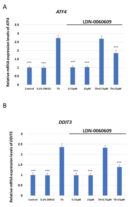 Briefly, HRA cells were pre-incubated for one hour with LDN-0060609 at a range of concentrations (0.75–50 μM) and then exposed to an ER stress inducer, Th, at 500 nM and incubated for two hours. Cells incubated with 500 nM Th alone for two hours (i.e., those under ER stress) were used as positive controls, and the cells cultured in complete AM cell culture medium alone were used as negative controls.