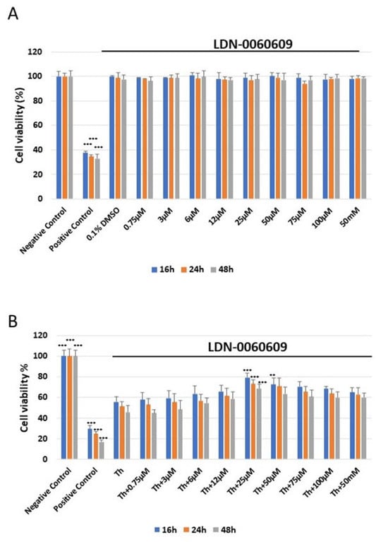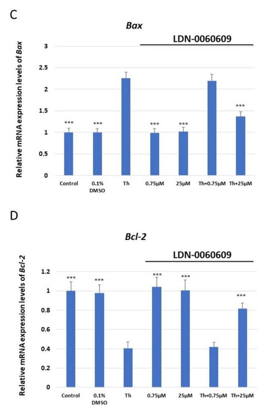 In addition, the effect of LDN-0060609 was analyzed in ER-stressed HRA cells. In this experiment, HRA cells were seeded in 6-well plates coated with poly-L-lysine at 2 × 105 in 2 mL of complete AM cell culture medium and cultured for 24 h. Subsequently, the HRA cells were pre-incubated for one hour with 2 mL of complete medium containing LDN-0060609 at concentrations ranging from 0.75 to 50 μM. Then, HRA cells were treated with 50 nM Th. Some cells were treated only with Th at 50 nM. The positive controls consisted of HRA cells suspended in 5% DMSO (Sigma-Aldrich Corp.), and the negative controls of cells suspended in 2 mL of complete medium. Following the treatment, all the samples were incubated for 24 h.