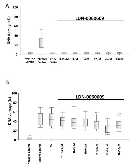 Genotoxicity analysis in HRA cells treated with the LDN-0060609 PERK inhibitor (A) and in ER-stressed HRA cells treated with LDN-0060609 (B), as indicated by the comet assay. All experiments were performed in triplicate. The value of cells scored for individual experiments was 100. Box plots show the median, first and third quartiles, minimum and maximum values. ** p < 0.01; *** p < 0.001 versus the negative control (A) and versus Th (B). Negative control—untreated HRA cells; Positive control—HRA cells treated with 99.9% dimethyl sulfoxide; 0.1% DMSO—HRA cells treated with the solvent, 0.1% dimethyl sulfoxide; Th—thapsigargin-treated HRA cells (ER-stressed HRA).