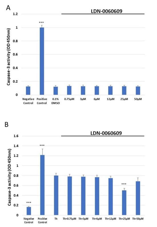 Assessment of the level of apoptosis in HRA cells (A) or ER-stressed HRA cells (B) following exposure to LDN-0060609. Results were determined by a caspase-3 assay. All experiments were performed in triplicate; values are expressed as mean ± SEM, n = 3. *** p < 0.001 versus the negative control (A) and versus Th (B). Negative control—untreated HRA cells; Positive control—HRA cells treated with 1 μM staurosporine; 0.1% DMSO—HRA cells treated with the solvent, 0.1% dimethyl sulfoxide; Th—thapsigargin-treated HRA cells (ER-stressed HRA).