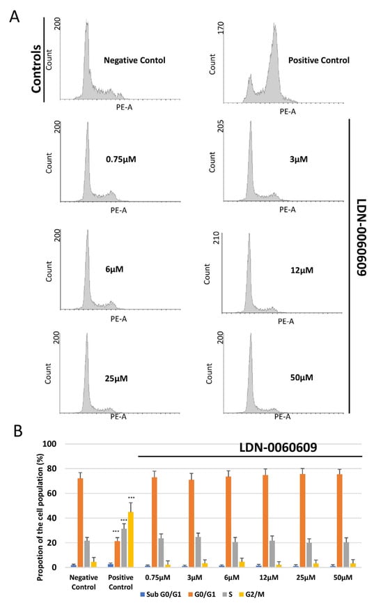 The cell cycle analysis was carried out using PI staining with flow cytometry. All experiments were repeated three times with similar results. The HRA cells were seeded in 6-well plates coated with poly-L-lysine (5 × 105/well) and cultured for 24 h in a complete AM cell culture medium. Then, HRA cells were incubated for 24 h with the LDN-0060609 at concentrations ranging from 0.75 to 50 μM or with 0.1% DMSO (Sigma-Aldrich Corp., St. Louis, MO, USA). The positive controls consisted of HRA cells exposed to 1 µM nocodazole (Sigma-Aldrich Corp., St. Louis, MO, USA) and incubated for 16 h, and the negative controls of cells cultured for 24 h in a complete AM medium.