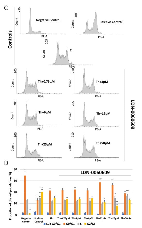 Flow cytometric analysis with propidium iodide (PI) staining of cell cycle progression in HRA cells exposed to LDN-0060609 alone (A,B) and ER-stressed HRA cells exposed to LDN-0060609 (C,D). The results are presented as histograms of DNA content (A,C) and bar graphs showing cell cycle distribution determined from the DNA content histograms (B,D). All experiments were performed in triplicate; values are expressed as mean ± SEM, n = 3. * p < 0.05, ** p < 0.01, *** p < 0.001 versus the negative control (B) and versus Th (D). Negative control—untreated HRA cells; Positive control—HRA cells treated with 1 μM nocodazole; Th—thapsigargin-treated HRA cells (ER-stressed HRA).