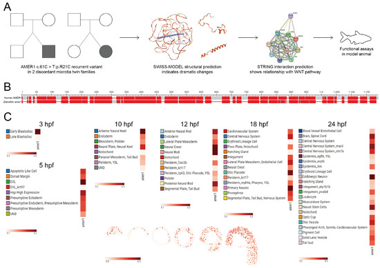 Identification of AMER1 and its homologous gene in zebrafish. (A) Schematic diagram of AMER1 sequences in families of patients with dichotomous monozygotic twins with microtia. The AMER1 variant (c.61C>T: p.R21C) was detected in two patients with sporadic microtia (shaded), as well as in their normal twins and parents (blank). The predicted protein structure showed dramatic changes from wildtype, and pathway prediction showed a relationship between AMER1 and the Wnt pathway. (B) BLAST analysis of sequences homologous to human AMER1 in zebrafish. (C) Expression profile of zebrafish amer1, as determined using the Spatial Transcript Omics DataBase.