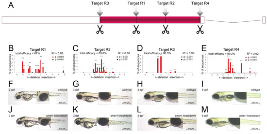 Knockdown of amer1 and phenotypic changes. (A) Schematic diagram showing the four amer1 gRNA targets of the CRISPR/Cas9 knockdown system. (B–E) PCR analysis, showing representative amer1 knockdown efficiencies of the four gRNA targets. (F-M) Brightfield images of embryos of (F–I) wildtype and (J–M) amer1 knockdown zebrafish at (F,J) 2, (G,K) 3, (H,L) 4, and (I,M) 6 dpf, showing malformed mandibles in the amer1 knockdown embryos.