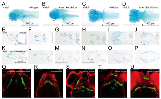 Phenotypic changes induced by amer1 knockdown, as shown by Alcian and WGA staining. (A–D) Alcian staining of embryos of (A,C) wildtype and (B,D) amer1 knockdown embryos at 4 dpf, showing malformation of Meckel’s and palatoquadrate cartilages in the amer1 knockdown embryos. (E–P) Alcian staining of tissue sections of embryos of (E–J) wildtype and (K–P) amer1 knockdown zebrafish at 4 dpf, showing that Meckel’s cartilage was severely deformed in amer1 knockdown embryos (red rectangles in (M–O)). (Q,R) WGA staining of wildtype embryos, showing regularly distributed, well-shaped chondrocytes, with Meckel’s cartilage and ceratohyal cartilage normally not observed in the same plane. (S–U) WGA staining of amer1 knockdown embryos, showing Meckel’s cartilage (red arrowheads) and palatoquadrate and ceratohyal cartilage (long red arrows) in the same plane. All cartilage was deformed and the arrangement of chondrocytes was disordered.