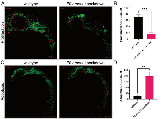 Because malformation of multiple cartilages was observed in amer1 knockdown embryos, the process by which chondrocytes develop from CNCCs was evaluated in zebrafish embryos. Determination of the numbers of CNCCs in wildtype and F0 amer1 knockdown embryos at 24 hpf showed that the proliferation of CNCCs, as determined by staining for PH3, was significantly lower in amer1 knockdown than in wildtype embryos (17.00 ± 3.46 vs. 69.67 ± 8.62 cells per fish, p = 0.0006) (Figure 6). Conversely, the number of cells that had undergone apoptosis, as determined by TUNEL staining, was significantly higher in amer1 knockdown than in wildtype embryos (197.33 ± 35.36 vs. 28.33 ± 7.50 cells per fish, p = 0.0013) (Figure 6).