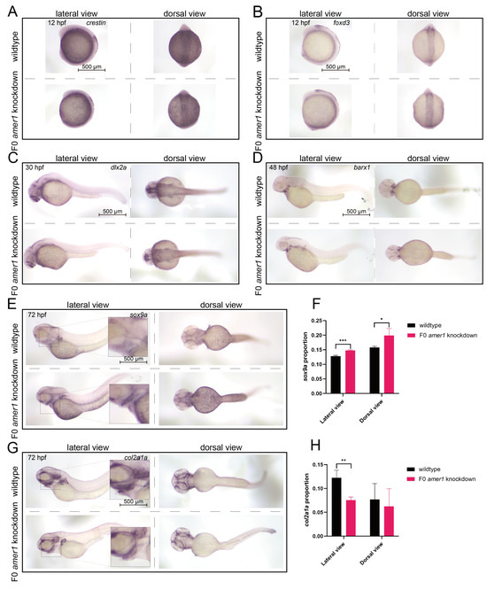 RNA probes were transcribed from linearized plasmids using the proper RNA polymerase (Roche Diagnostics, Tokyo, Japan; Stratagene Japan, Tokyo, Japan). Whole-mount in situ hybridization and immunostaining were performed as described in [28]. Embryos were fixed overnight in 4% paraformaldehyde, followed by dehydration in methanol and storage in methanol at −20 °C. Primers for in situ hybridization included those for amer1 (forward, 5′-GTACCCAACAGTGACGAGGG-3′; reverse, 5′-GGGCCAAAGGGAGAACTTGA-3′), and for crestin, foxd3, dlx2a, barx1, sox9, col2a1a, fgf3, tbx1, and nkx2.3 (Supplementary Table S1).