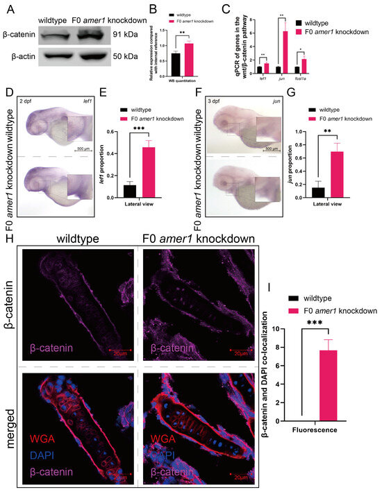 Because the amer1 gene has been associated with the Wnt/β-catenin pathway, a vital regulatory pathway in early craniofacial and pharyngeal arch development, amer1 knockdown may cause malformations in amer knockdown embryos by interfering with the wnt/β-catenin pathway. Western blotting of full-embryo proteins extracted from wildtype and F0 amer1 knockdown embryos at 4 dpf showed that β-catenin expression was significantly higher in amer1 knockdown embryos (Figure 8A,B). Evaluation by qPCR of genes acting downstream of β-catenin showed that the levels of expression of several genes, including lef1, jun, and fosl1a, were significantly higher (p = 0.0069 for lef1, p = 0.0020 for jun, p = 0.0113 for fosl1a) in amer1 knockdown embryos (Figure 8C). Moreover, in situ hybridization showed that lef1 and jun expression was upregulated in the mandible region of amer1 knockdown embryos at 2 and 3 dpf (Figure 8D–G).