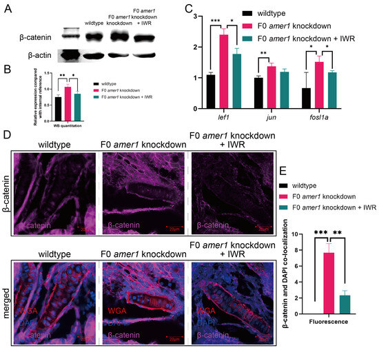 Effects of IWR-1-endo on components of the Wnt pathway in F0 amer1 knockdown embryos. (A,B) Western blotting and quantitation showing that β-catenin expression was lower in IWR-treated amer1 knockdown embryos than in amer1 knockdown embryos at 4 dpf. (C) qPCR showing that the levels of expression of lef1, jun, and fosl1a were lower in IWR-treated than in untreated amer1 knockdown embryos. (D) Co-localization of β-catenin with the cell nucleus in the ceratohyal cartilage was reduced in amer1 knockdown embryos treated with IWR. (E) Manual counting of co-localization of β-catenin with cell nuclei in embryos with different treatments (n = 3 each). * p < 0.05; ** p < 0.01; *** p < 0.001.