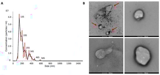 The results of nanoparticle tracking assay (NTA) and transmission electron microscopy (TEM) evidenced the presence of nanovesicles isolated from dBP by enzymatic isolation and differential centrifugation. NTA was performed on MBVs resuspended in particle-free phosphate-buffered saline (PBS) and showed that a mean of 1.9 × 108 ± 0.22 × 108 MBVs/mL, starting from 100 mg of dry weight dBP, could be obtained. The MBVs showed a mode size of 142 ± 1.5 nm. A representative curve of one NTA analysis out of the triplicate is shown in Figure 1A, indicating an MBV size peak ranging from 100 to 200 nm, correlated to the size of MBVs found in the literature. MBVs’ size range was also confirmed by TEM analysis (Figure 1B), in which MBVs characterised by a generally rounded lipidic membrane, stained in black by osmium tetroxide, were found. Some MBVs were observed aggregated to each other (evidenced by red arrows in Figure 1B). Furthermore, most MBVs displayed additional roundish lipidic structures inside the vesicles.