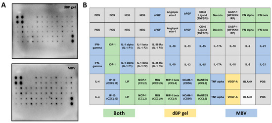 (A): Representative antibody array membranes of dBP gel and MBV samples of experimental triplicates using different MBV batches. (B): Table showing the order of the cytokine spots on the antibody array membrane. Highlighted in green are cytokines found to be expressed in both dBP gel and MBVs; in yellow, cytokines expressed in dBP gel only; in blue, cytokines expressed in MBVs only; and in grey the cytokines that were not expressed in any of the samples.