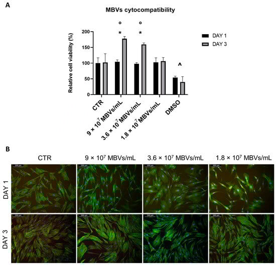 (A): MTT viability assay on NHDF cells treated with different concentrations of MBVs for 1 and 3 days. Data are indicated as means ± S.D. of triplicate. *: day 1 vs. day 3; ◦: MBVs vs. CTR day 3; ^ DMSO vs. all conditions, p < 0.05. (B): Phalloidin-DAPI immunofluorescence staining on NHDF cells treated with different concentrations of MBVs for 1 and 3 days. Images are representative of experimental triplicates.