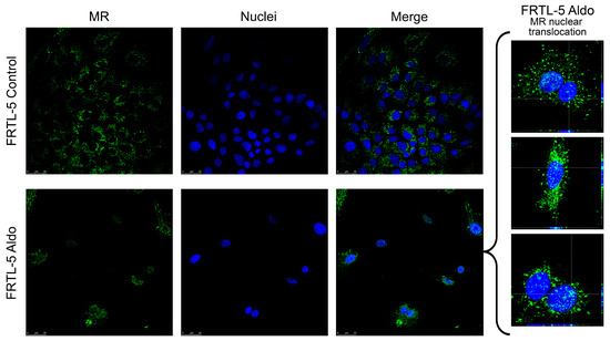 Confocal microscopy was used to investigate the presence and localisation, of the MR protein in the FRTL-5 cell line. As Figure 2 shows, MR (in green) was found in the cytoplasm but was not detected in the nucleus of the control cells. After 24 hours’ stimulation with 1 µM Aldo, the receptor protein was observed to have increased in the proximity of the nucleus (marked in blue), and there was an evident translocation in the nucleus, as shown in the orthogonal projection reported in Figure 2.