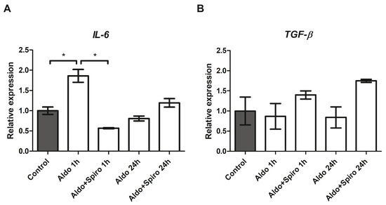 (A,B) mRNA expression levels in the FRTL-5 cell line assessed by quantitative real-time polymerase chain reaction. (A) IL-6 gene expression; (B) TGF-β gene expression. Aldo 1 h = Aldosterone 1 µM for 1 h; Aldo+Spiro 1 h = Aldosterone 1 µM combined with Spironolactone 10 µM for 1 h; Aldo 24 h = Aldosterone 1 µM for 24 h; Aldo+Spiro 24 h = Aldosterone 1 µM combined with Spironolactone 10 µM for 24 h. Experiments were performed in triplicate. * = p < 0.001.