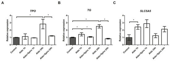 After 24 h, treatment with Aldo resulted in a 2.83-fold upregulation of thyroid peroxidase (TPO; p < 0.001) and a 2.52-fold upregulation of thyroglobulin (TG; p < 0.001) mRNAs compared with the untreated control group (Figure 4A,B). In both cases, the effect was reversed when Aldo was co-incubated with Spiro (p = 0.0016 and p < 0.001, respectively). Furthermore, treatment with Aldo resulted in a 1.43-fold increase in TG expression after 1 h (p = 0.002), and again, the effect was reversed (p = 0.003) when Aldo was combined with Spiro.
