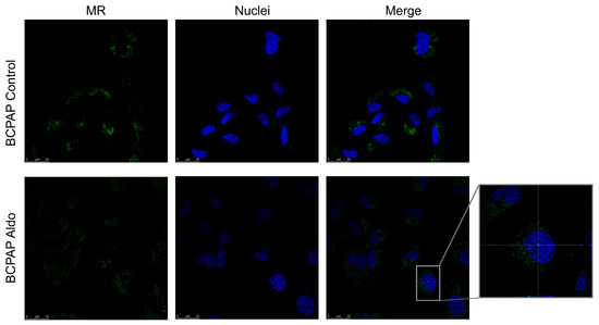Confocal microscopy showing MR protein expression, localisation, and activation in BCPAP. Nuclear translocation of MR in BCPAP treated with aldosterone can be seen in the expanded image detail. MR is shown in green; DNA stained with DRAQ5™ is shown in blue. Z-interval 1 μm. Magnification: 63× oil immersion objective. Scale bar = 25 μm. MR = mineralocorticoid receptor.