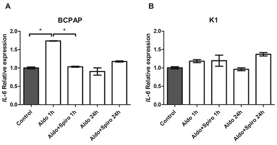 (A,B) IL-6 mRNA expression levels in the PTC (BCPAP and K1) cell lines assessed by quantitative real-time polymerase chain reaction. (A) IL-6 gene expression in the BCPAP cell line; (B) IL-6 gene expression in the K1 cell line. Aldo 1 h = Aldosterone 1 µM for 1 h; Aldo+Spiro 1 h = Aldosterone 1 µM combined with Spironolactone 10 µM for 1 h; Aldo 24 h = Aldosterone 1 µM for 24 h; Aldo+Spiro 24 h = Aldosterone 1 µM combined with Spironolactone 10 µM for 24 h. Experiments were performed in triplicate. * = p < 0.001.