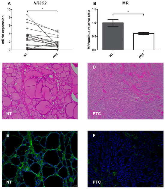 (A–F) Mineralocorticoid receptor gene and protein expression in normal human thyroid tissue compared with papillary thyroid cancer tissue. (A) Representation of the Wilcoxon test for paired data on NR3C2 mRNA expression: each PTC tissue sample was compared with its healthy tissue counterpart; (B) Quantification of mean fluorescence intensity (MFI); (C,D) Representative images of the immunohistochemistry analysis of normal thyroid tissue and papillary thyroid cancer tissue stained with hematoxylin and eosin; (E,F) Immunofluorescence of normal thyroid tissue and papillary thyroid cancer tissue (green = MR, blue = nucleus). Magnification: objective 10×. Scale bar = 100 μm. NT = normal thyroid tissue; PTC = papillary thyroid cancer. * = p < 0.001.