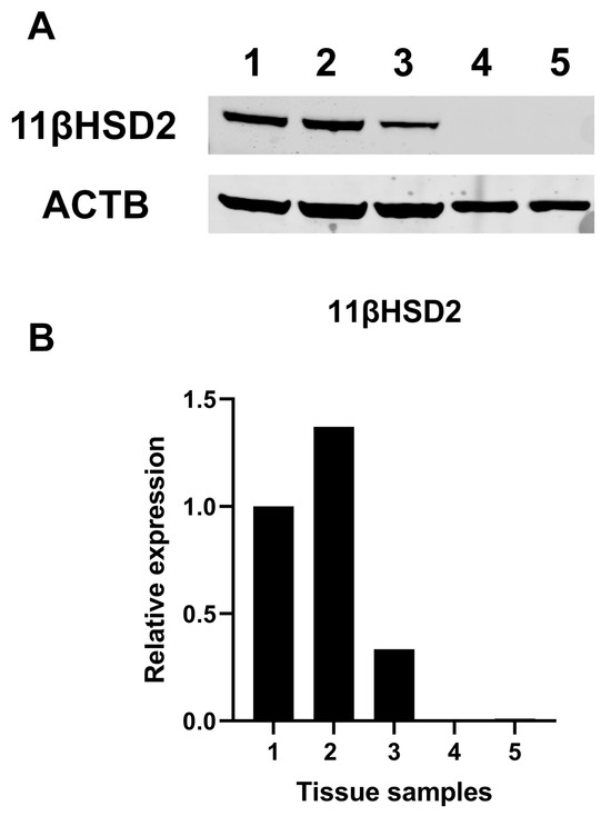 Western blot analysis for 11β-Hydroxysteroid dehydrogenase type 2. (A) Representative Western blot analysis for different tissue samples. (B) Quantification of band intensity, Samples 1–3: healthy counterparts of human kidney carcinoma specimens; Samples 4, 5: healthy counterparts of human papillary thyroid cancer. 11βHSD2 = 11β-Hydroxysteroid dehydrogenase type 2.