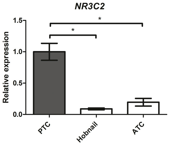 NR3C2 mRNA expression levels in different human thyroid cancer tissues assessed by quantitative real-time polymerase chain reaction. PTC = classic variant of papillary thyroid cancer; ATC = anaplastic thyroid cancer. * = p < 0.001.