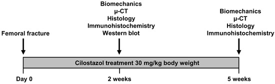 Experimental protocol of the cilostazol treatment. Twenty-one mice received daily 30 mg/kg body weight cilostazol dissolved in 100 µL saline by oral gavage starting on the day of fracture. Control animals (n = 21) received equal amounts of vehicle (saline). At 2 weeks and 5 weeks after fracture, the femora were analyzed by means of biomechanics, µ-CT, histology, and immunohistochemistry. In addition, Western blot analysis for the quantification of protein expression was performed at 2 weeks after fracture.
