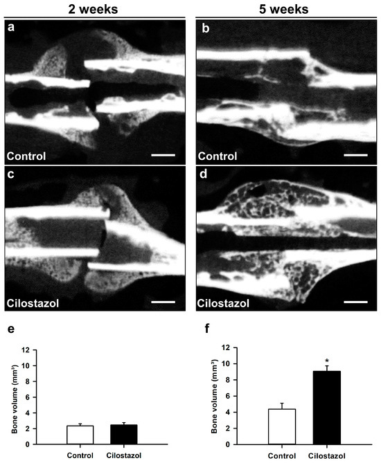 The X-rays taken at 2 weeks after fracture showed clear signs of callus formation in cilostazol-treated animals and controls (Figure 2a,c). At 5 weeks, the femora in both groups exhibited complete osseous bridging (Figure 2b,d). Of note, implant dislocation was not observed in any of the animals operated for the present study.