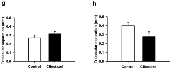 (a–d) Representative µCT images of mouse femora in controls (a,b) and cilostazol-treated animals (c,d) at 2 (a,c) and 5 weeks (b,d) after fracture. Scale bars: 0.75 mm. (e–h) µCT analysis of bone volume (e,f) and trabecular separation (g,h) in controls (white bars) and cilostazol-treated animals (black bars) at 2 ((e,g); n = 8) and 5 weeks ((f,h); n = 9) after fracture. Mean ± SEM; * p < 0.05 vs. control. (e,h) Non-parametric data; analysis performed by Mann–Whitney U-test. (f,g) Parametric data; analysis performed by unpaired Student’s t-test.