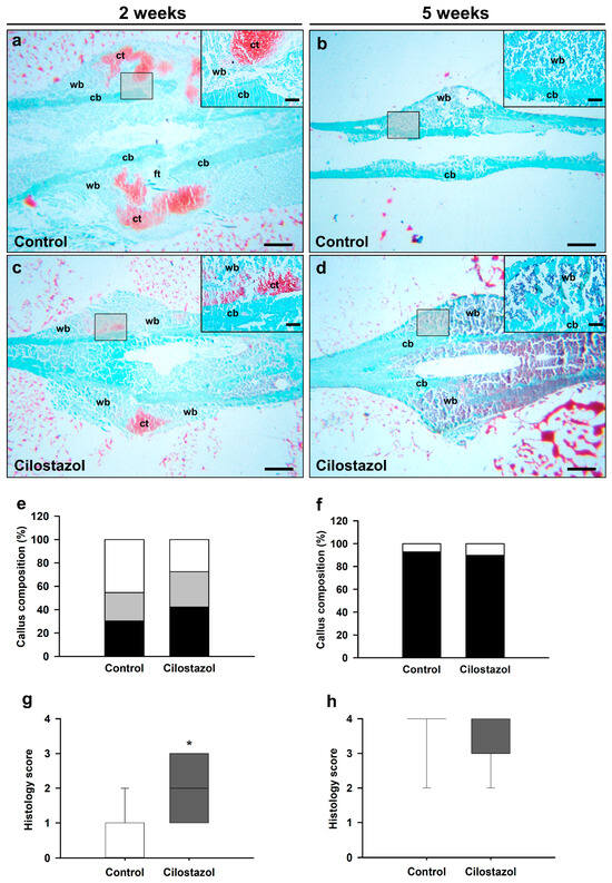 (a–d) Representative histological images of safranin-O-stained femora of controls (a,b) and cilostazol-treated animals (c,d) at 2 (a,c) and 5 weeks (b,d) after fracture. Scale bars: 0.75 mm. A higher magnification of the callus tissue is provided for better visualization of fibrous tissue (ft), cartilaginous tissue (ct), woven bone (wb), and cortical bone (cb). Scale bars 0.12 mm. (e,f) Callus composition (%), including fibrous tissue (white), cartilaginous tissue (gray), and osseous tissue (black), of femora of controls (n = 8–9) and cilostazol-treated animals (n = 8–9) at 2 (e) and 5 weeks (f) after fracture. (g,h) Analysis of the quality of fracture bridging by the histology score of femora of controls (n = 8–9) and cilostazol-treated animals (n = 8–9) at 2 (g) and 5 weeks (h) after fracture. Data are given in median and quartiles; * p < 0.05 vs. control. (e) Osseous and cartilaginous tissue data are parametric; analysis performed by unpaired Student’s t-test. (e) Fibrous tissue data (f–h) are non-parametric; analysis performed by Mann–Whitney U-test.