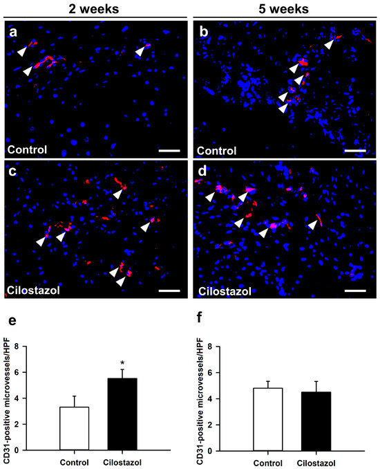 (a–d) Representative immunohistochemical images of CD31-positive microvessels (arrowheads) within the callus tissue of controls (a,b) and cilostazol-treated animals (c,d) at 2 weeks (a,c) and 5 weeks (b,d) after fracture. Scale bars: 50 µm. (e,f) CD31-positive microvessels/HPF in controls (white bars) and cilostazol-treated mice (black bars) at 2 ((e); n = 8) and 5 weeks ((f); n = 9) after fracture. Mean ± SEM; * p < 0.05 vs. control. All data are parametric; analysis performed by unpaired Student’s t-test.