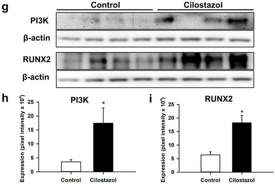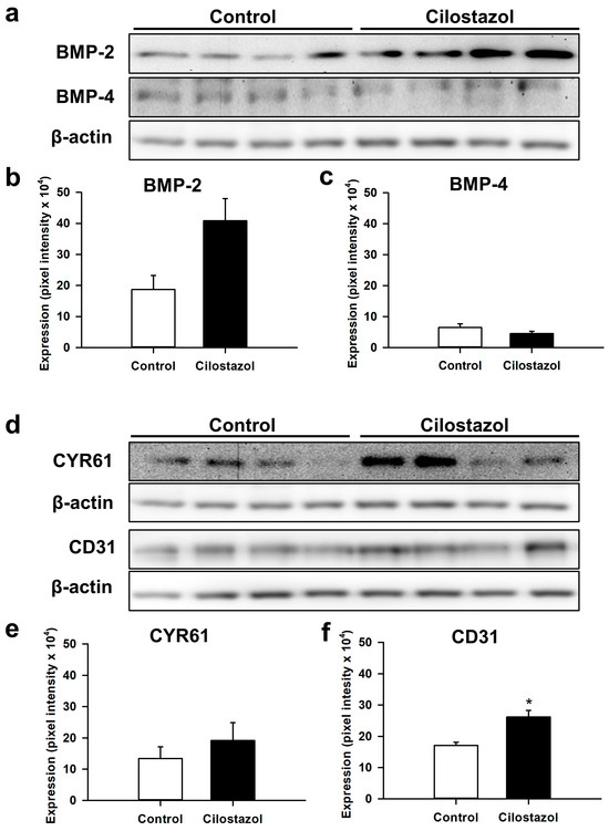 Western blot analysis at 2 weeks after fracture revealed an over 2-fold higher expression of BMP-2 in cilostazol-treated mice when compared to controls (Figure 6a,b). However, the difference did not prove to be statistically significant. The analysis of BMP-4 (Figure 6a,c) and CYR61 (Figure 6d,e) expression within the callus tissue demonstrated no significant difference between the two groups. However, in line with our immunohistochemical data, we found a significantly increased expression of CD31 in cilostazol-treated mice (Figure 6d,f). Additional analyses also showed a significantly higher expression of PI3K and RUNX2 within the callus tissue of cilostazol-treated animals when compared to controls (Figure 6g–i).