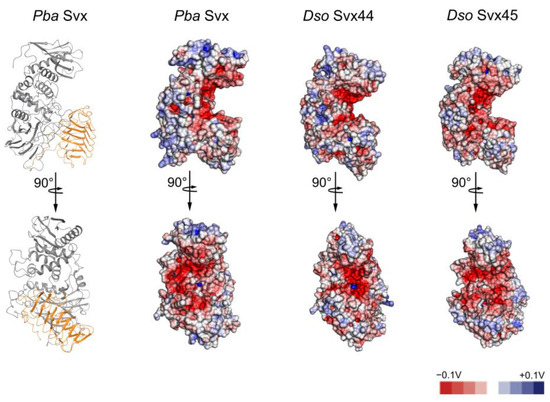 Electrostatic surface maps of the Svx proteins of Pectobacterium atrosepticum (Pba Svx) and Dickeya solani (Dso Svx44 and Dso Svx45). All surface maps are demonstrated at the same angle as the ribbon structure of the Pba Svx protein on the left, where the peptidase domain is indicated in gray and the acyltransferase-like domain is indicated in orange. Red-to-blue colors on electrostatic surfaces correspond to negative-to-positive electrostatic potentials.