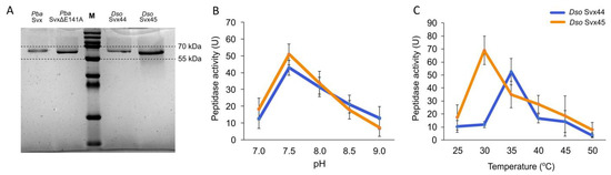 To verify whether Dso Svx44 and Dso Svx45, similar to Pba Svx [26], possess peptidase activity, recombinant Dso Svx44 and Dso Svx45 proteins were obtained (Figure 3A). The enzymatic assay with azocasein as a substrate proved that both proteins possessed peptidase activity. Both proteins displayed maximum peptidase activity at pH 7.5 (Figure 3B), similar to Pba Svx [26]. Dso Svx44 and Dso Svx45 peptidase activity was most pronounced at 35 °C and 30 °C, respectively (Figure 3C), whereas Pba Svx displayed maximum peptidase activity at 40 °C [26].