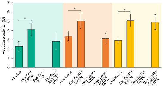 Peptidase activities of the Svx proteins of Pectobacterium atrosepticum (Pba Svx) and Dickeya solani (Dso Svx44 and Dso Svx45). The activities were measured in the absence (Pba Svx, Dso Svx44, Dso Svx45) or presence of 1 mM ZnSO4 (Pba Svx+ZnSO4; Dso Svx44+ZnSO4; Dso Svx45+ZnSO4) or 1 mM EDTA (Pba Svx+EDTA; Dso Svx44+EDTA; Dso Svx45+EDTA) or both 1 mM EDTA and 1 mM ZnSO4 (Pba Svx+ZnSO4+EDTA; Dso Svx44+ZnSO4+EDTA; Dso Svx45+ZnSO4+EDTA). For all three proteins, peptidase activity was measured in 100 mM Tris-HCl buffer pH, 7.5. The activities of Pba Svx, Dso Svx44 and Dso Svx45 were assayed at 40 °C, 35 °C and 30 °C, respectively (at the temperature of maximum activity of each protein). One unit of peptidase activity was defined as the amount of enzyme required to produce an absorbance change of 0.1 per min per 1 nmol of the corresponding protein. The presented values are the means ± SD of five replicates. Asterisks (*) show a significant difference (Mann–Whitney two-sided test, p < 0.05) between the variants designated by brackets.