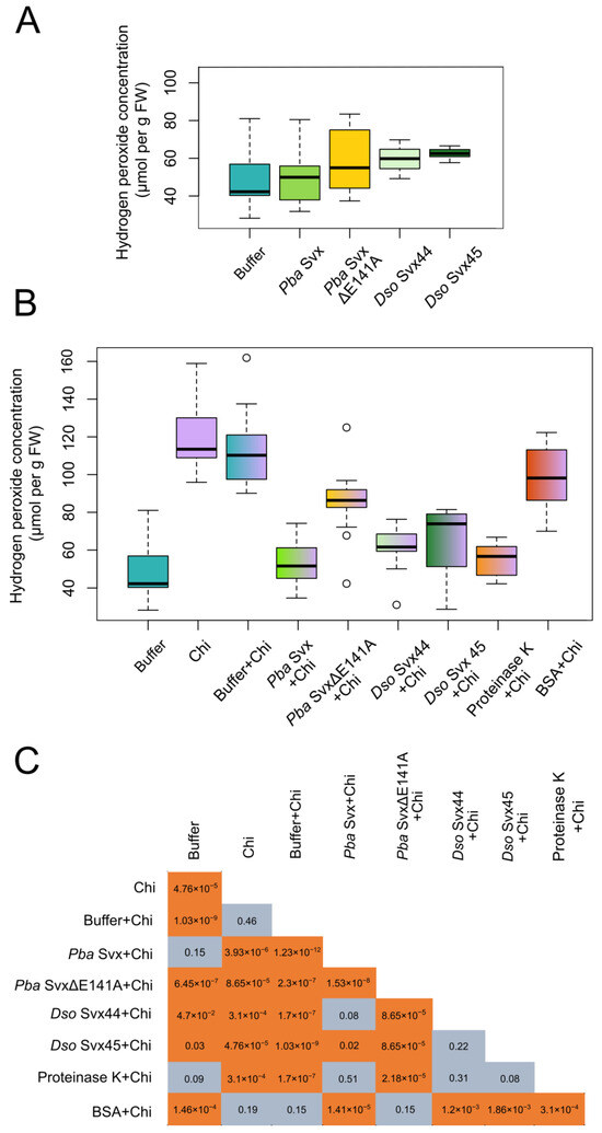 Effect of the Svx proteins of Pectobacterium atrosepticum (Pba Svx) and Dickeya solani (Dso Svx44 and Dso Svx45) on the level of hydrogen peroxide in tobacco leaves. (A) The levels of hydrogen peroxide were measured 12 h after infiltration with 10 mM Tris-HCl, pH 7.5, 50 mM NaCl (dark turquoise), 1 µM Pba Svx (salad green), 1 µM Pba SvxΔE141A (yellow), 1 µM Dso Svx44 (pale green), or 1 µM Dso Svx45 (dark green). (B) Plant leaves were first infiltrated (except for the variant Chi, purple) with buffer (Buffer, dark turquoise and Buffer+Chi, dark turquoise-purple), 1 µM Pba Svx (Pba Svx+Chi, salad green-purple), 1 µM Pba SvxΔE141A (Pba SvxΔE141A+Chi, yellow-purple), 1 µM Dso Svx44 (Dso Svx44+Chi, pale green-purple), 1 µM Dso Svx45 (Dso Svx45+Chi, dark green-purple), 1 µM proteinase K (proteinase K+Chi, orange-purple), or 1 µM bovine serum albumin (BSA+Chi, red-purple), and 12 h later, the same leaf areas of all variants (except for the variant Buffer) were infiltrated with 1 µM chitooctaose. The levels of hydrogen peroxide were measured six hours after infiltration with chitooctaose. (C) FDR values obtained by statistical analysis (Mann–Whitney test with Benjamini—Hochberg adjustment, FDR < 0.05) of differences in the level of hydrogen peroxide between experimental groups presented in (B) (orange background–significant difference; gray background–insignificant difference). No significant differences in the level of hydrogen peroxide were observed between the experimental groups presented in (A). All experimental variants were analyzed in at least five biological replicates. FW—fresh weight.