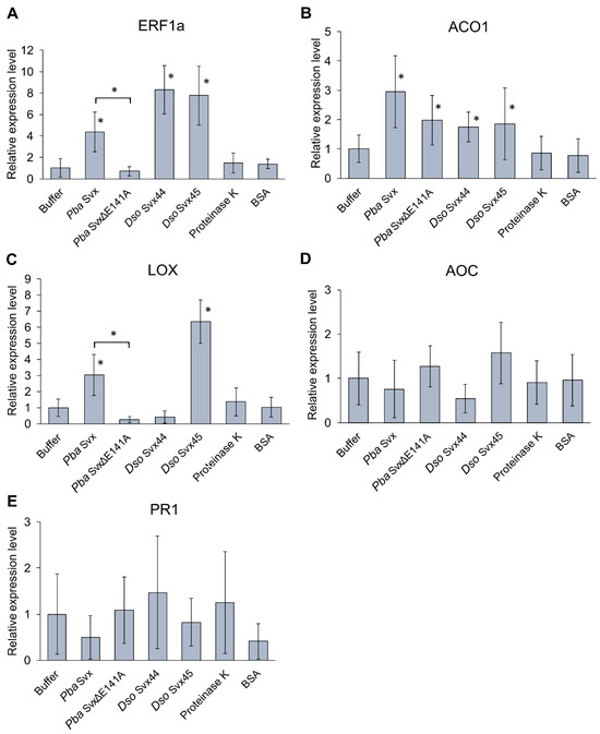 All three target proteins (Pba Svx, Dso Svx44 and Dso Svx45) induced the expression of marker genes of the ET-mediated hormonal system, ERF1a and ACO1, especially the gene encoding ERF1a (Figure 6A,B). The mutant Pba SvxΔE141A protein also induced the expression of the ACO1 gene but had no effect on the expression of the ERF1a gene. Pba Svx and Dso Svx45 proteins, but not Dso Svx44 and Pba SvxΔE141A, induced the expression of the LOX gene (Figure 6C), but none of the assayed proteins affected the expression level of the AOC gene (Figure 6D) as well as the marker for the SA-mediated hormonal system PR1 (Figure 6E).