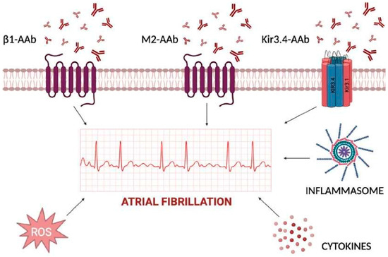 The involvement of circulating autoantibodies against M2-muscarinic acetylcholine receptors (anti-M2-R) in AF has been studied in preclinical models [6] and in humans as well [7]. The increased expression of tumor growth factor (TGF)-β1 and connective tissue GF (CTGF) in left atrial appendage tissues correlates with the severity of atrial fibrosis [8].