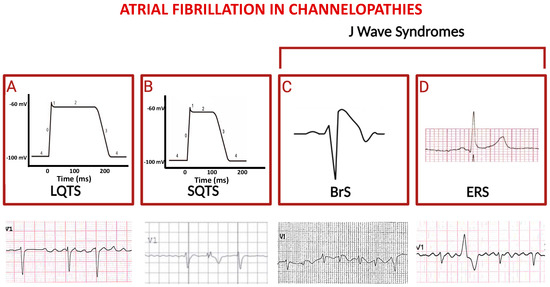 Schematic representation of principal channelopathies in which atrial fibrillation occurs. The schemes in (A) and (B) indicate prolonged versus shortened cardiomyocyte action potential duration (phases are numbered from 0 to 4) in LQTS and in SQTS, respectively; third and fourth squares show paradigmatic ST-segment upward shifts in right precordial lead (Brugada syndrome, (C)) and in peripheral lateral I lead (Early Repolarization Syndrome, (D)). Electrocardiographic tracings reported below depict atrial fibrillation in the context of the above indicated diseases (ventricular extra-systolic beats appear in second and fourth ECGs).