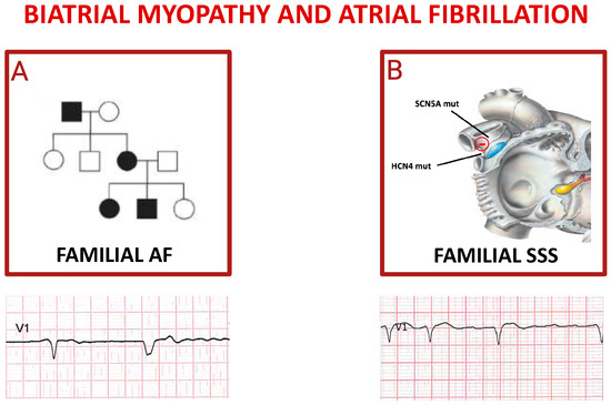Inherited atrial fibrillations. Panel (A) shows autosomal dominant pattern of inheritance of familial atrial fibrillation; the pedigree depicts an affected grandfather (black square) transmitting mutation to one daughter (black circle) who gave birth to a not affected daughter (white circle) and two affected children. The ECG reported below shows a spontaneous QRS complex followed by a paced QRS complex in a patient affected by FAF. Cartoon in (B) depicts the main genes whose mutations trigger sick sinus syndrome (SSS), mostly characterized by alternance of brady- and tachy-cardia rhythms in the same subject (see related ECG).