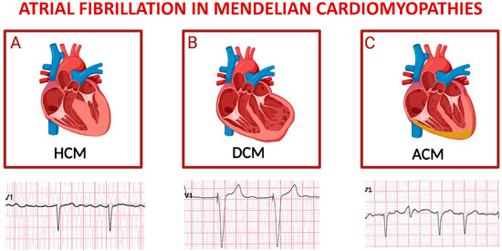 Arrhythmogenic cardiomyopathy (ACM) is a genetic disease of the myocardium, characterized by autosomal dominant inheritance, with variable penetrance and incomplete expression [89]. Although rare autosomal recessive forms, such as Carvajal syndrome and Naxos disease, have also been described, ACM is considered one of the main causes of SCD among young people and athletes. AF has been observed in 14% of patients with defined ACM and is correlated with the severity of the disease phenotype, indicating involvement of the atrial myocardium in disease progression (Figure 4C) [90].