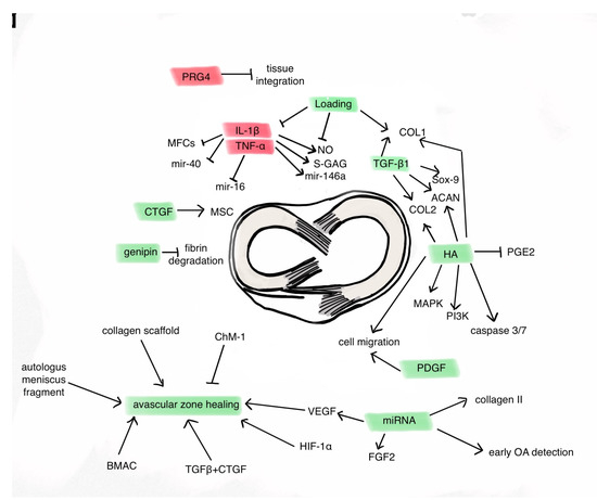 Two strategies exist for molecularly stimulating meniscus healing: either anabolic growth factors are induced to promote healing, or catabolic factors are inhibited to restrict the degradation process. IL-1β and TNF-α expedite the advancement of osteoarthritis through the facilitation of the catabolic cascade. Endostatin demonstrates inhibitory effects on the vascular endothelial growth factor, especially in the avascular zone. Hence, the inhibition of these cytokines may serve as a potential preventive measure against meniscus degeneration subsequent to an injury [19].