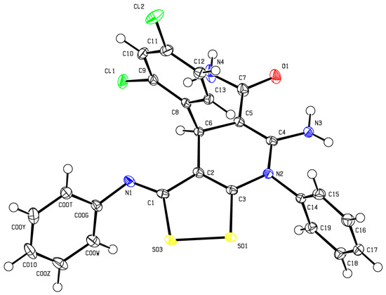 ORTEP drawing of X-ray structure for 6-amino-4-(2,4-dichlorophenyl)-7-phenyl-3-(phenylimino)-4,7-dihydro-3H-[1,2]dithiolo[3,4-b]pyridine-5-carboxamide 3d (CCDC deposition number 2310349).