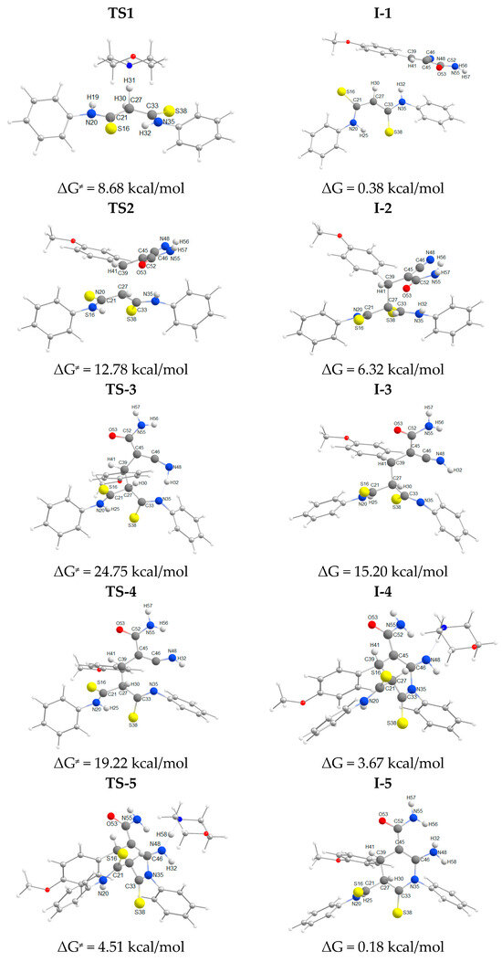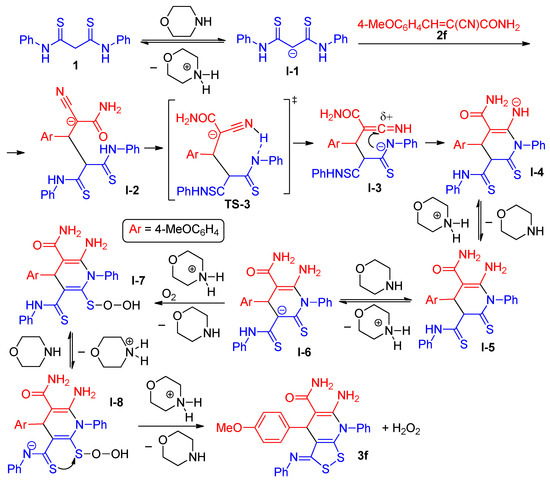 The first step of the cascade reaction mechanism involves the deprotonation of the C27 atom (Scheme 6, Figure 2) of the dithiomalondianilide 1 molecule followed by the Michael addition of the resulting anion to the C39 atom of 2-cyano-3-(4-methoxyphenyl)- acrylamide 2f. The molecular structures of the intermediates (I) and transition states (TS) are given in Figure 2.